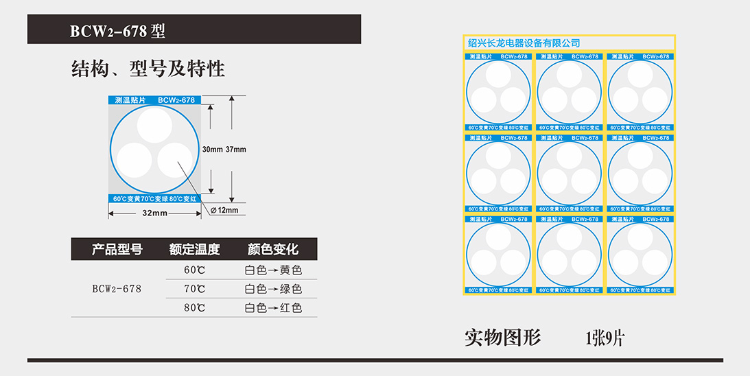 2.使用時如欲知道監溫部位溫度逐漸上升的情況,可粘貼兩片以上不同額定溫度的變色測溫貼片,亦可使用BCW-678型、BCW-789型(每片中含三種額定溫度)貼片。