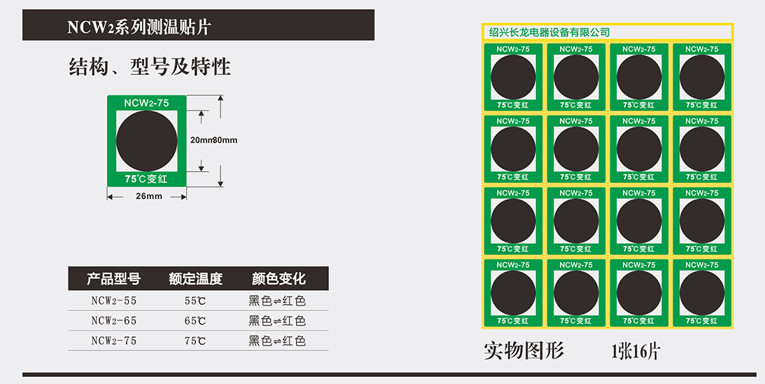NCW系列測溫貼片,一旦監溫部位溫度達到或超過測溫貼片的額定溫度,變色測溫貼片立即由黑色變紅色,并在測溫貼片上顯示該處超溫的數字,冷卻下來后,測溫貼片又馬上恢復原來的顏色(黑色),即所變顏色可逆,貼片可繼續使用。